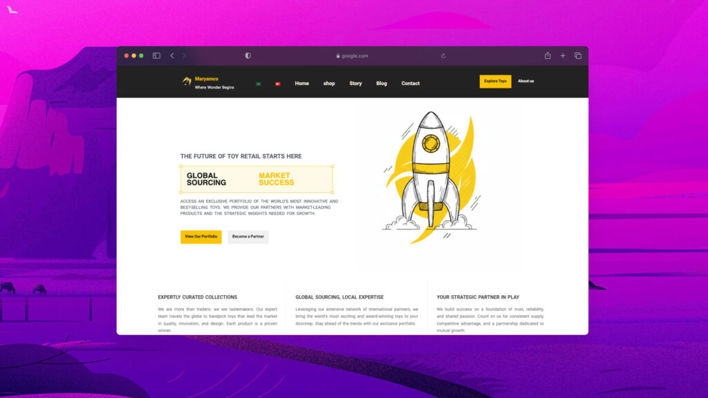 چالش «بازرگانی مریم» فراتر از فروش اسباب‌بازی بود؛ چالش «ساختن یک پل» بود. پلی بین ایران، ترکیه و عراق. ما به سایتی احتیاج داشتیم که نه فقط به ۳ زبان مختلف (انگلیسی، عربی، ترکی) «حرف» بزنه، بلکه بتونه با ۳ «فرهنگ» مختلف «ارتباط» بگیره و «اعتماد» بسازه. این پروژه برای من، طراحی یک «دیپلمات دیجیتال» بود؛ فضایی حرفه‌ای و شفاف که شرکای تجاری در بغداد یا استانبول، با همون راحتی و اعتمادی که یه شریک در تهران داره، بتونن کاتالوگ‌ها رو بررسی کنن و کار رو پیش ببرن.
